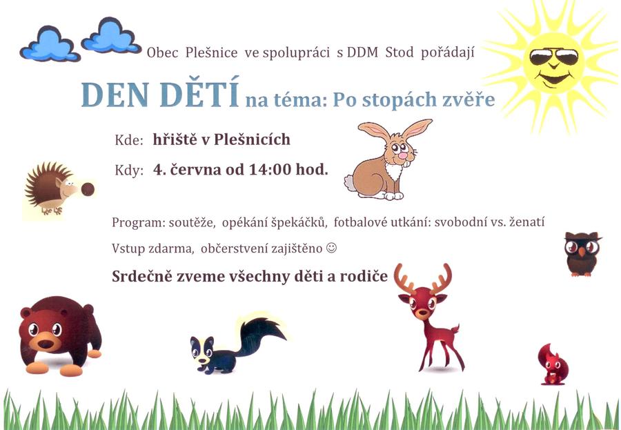 Dne 4. června 2011 od 14. 00 hod obec Plešnice ve spolupráci s DDM Stod pořádá na hříšti Dětský den na téma : Po stopách zvěře. Ostatní podrobnosti jsou na plakátě .