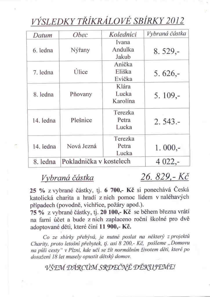 Oznamujeme , že dne 14.1.2011 v obci Plešnice proběhla Tříkrálová sbírka ve které bylo vybráno 2543,- Kč. Všem občanům , kteří přispěli za jejich solidaritu srdečně děkujeme.