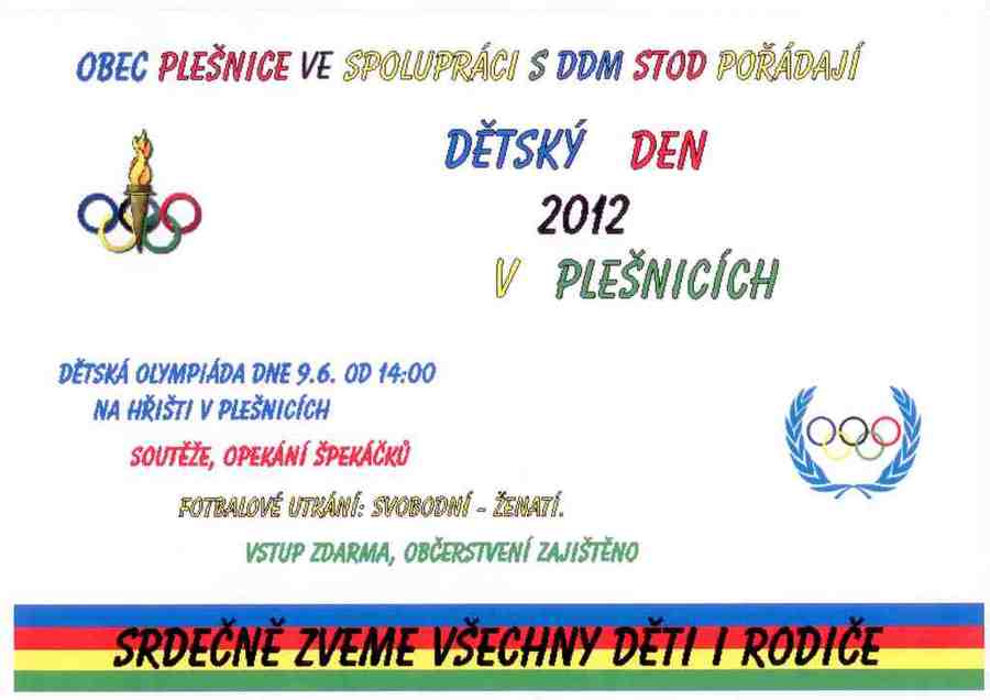 DĚTSKÝ DEN NA TÉMA OLYMPIJSKÉ HRY SE BUDE KONAT V PLEŠNICÍCH 9.6.2012 OD 14.00 HODIN.PODROBNOSTI NAJDETE NA PLAKÁTU.