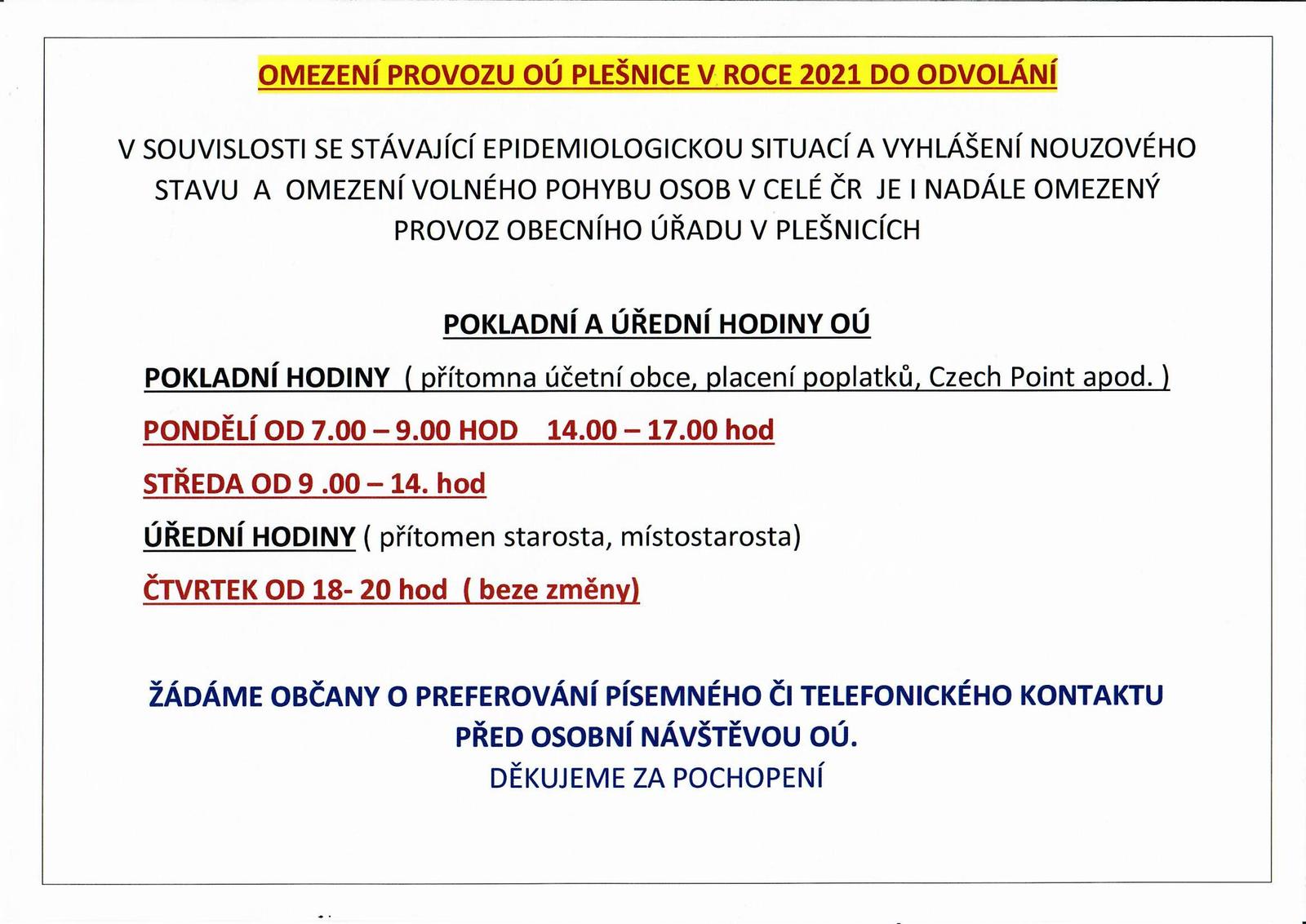 Úvod > Aktuality > Omezení provozu obecního úřadu v Plešnicích v roce 2021