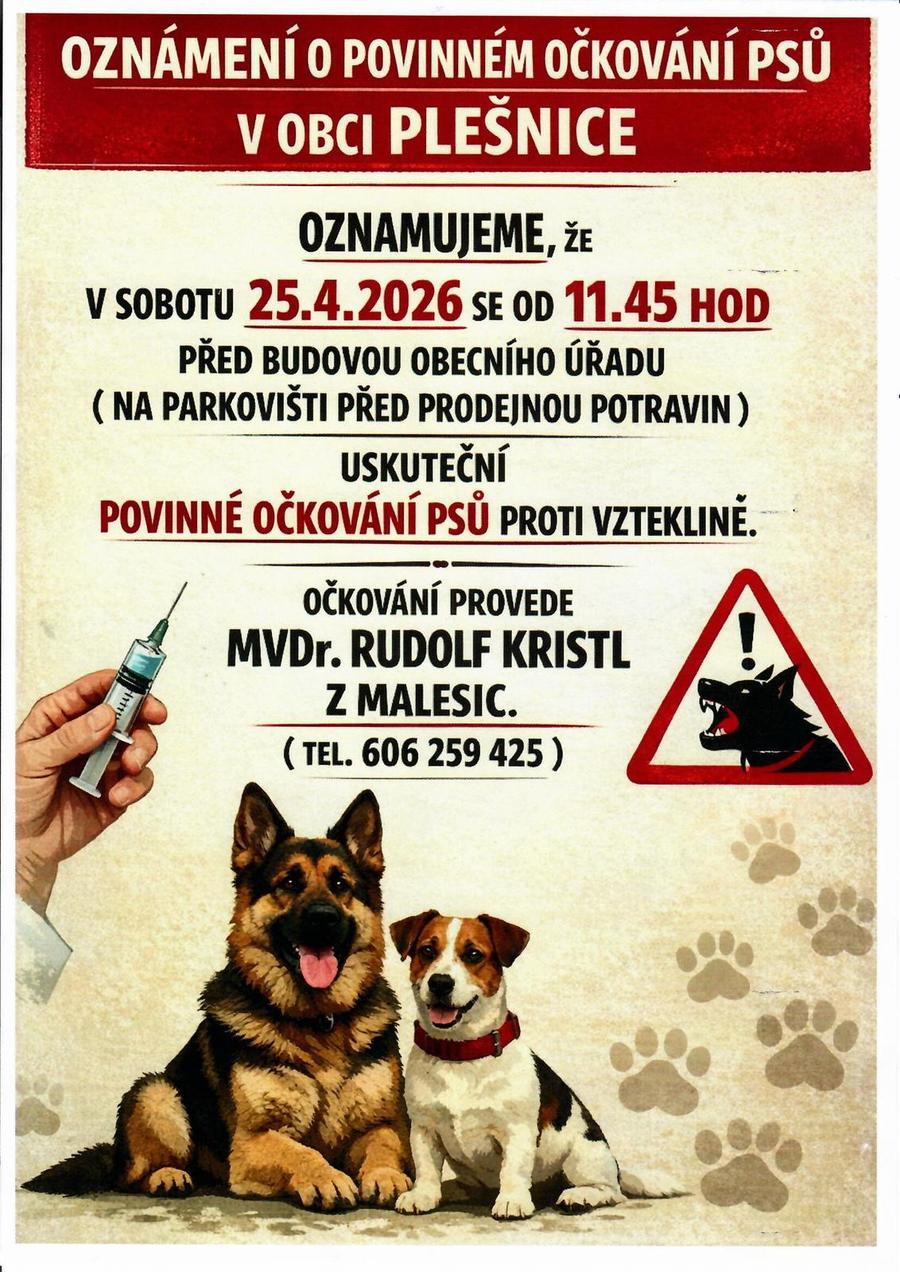 Úvod > Aktuality > Oznámení o očkování psů v obci Plešnice 25.4.2026