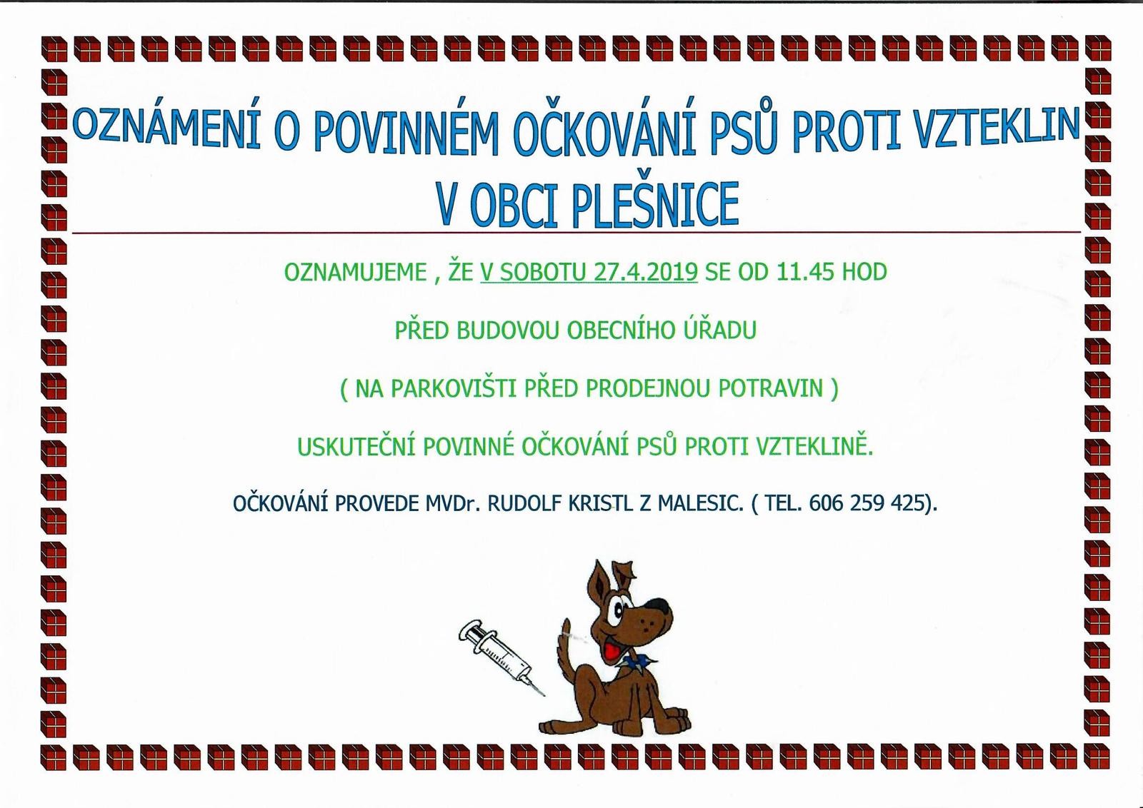 Oznámení o povinném očkování psů proti vzteklině 27.4.2019