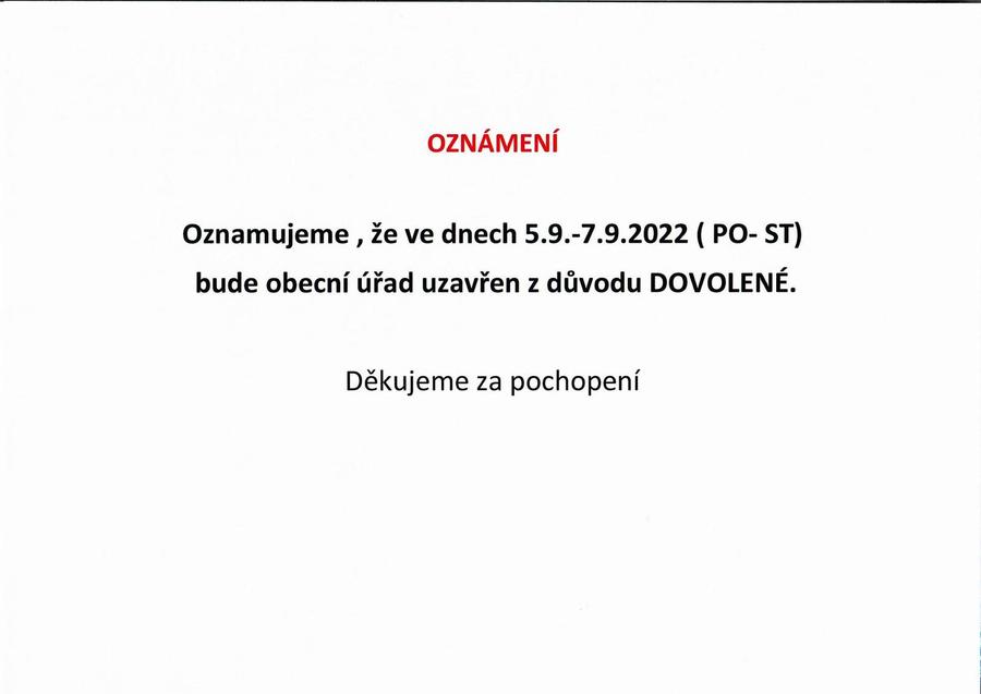 Úvod > Aktuality > Oznámení o uzavření obecního úřadu od 5.-7.9.2022