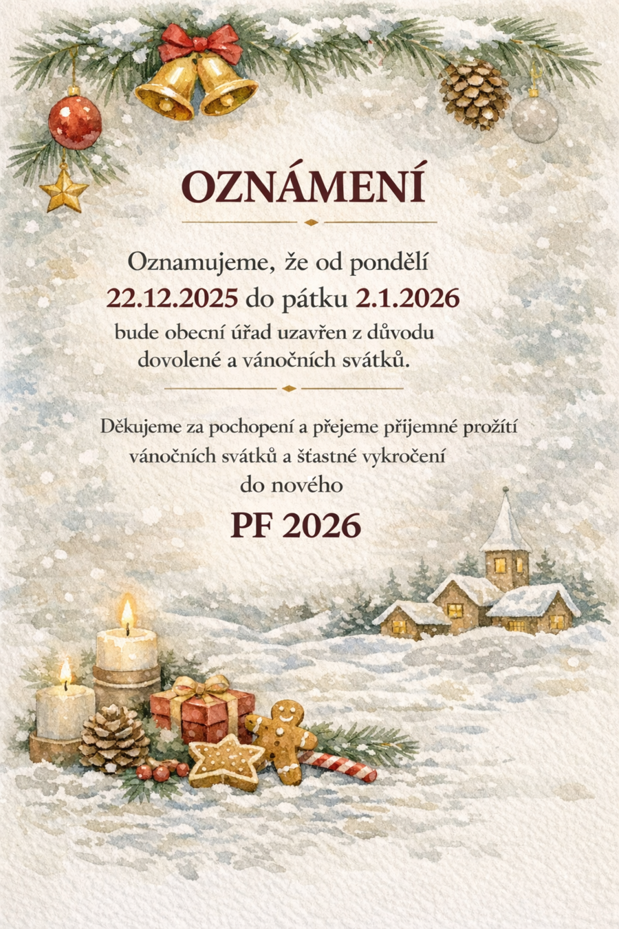 Úvod > Aktuality > Oznámení o uzavření obecního úřadu v souvislosti s vánočními svátky a koncem roku