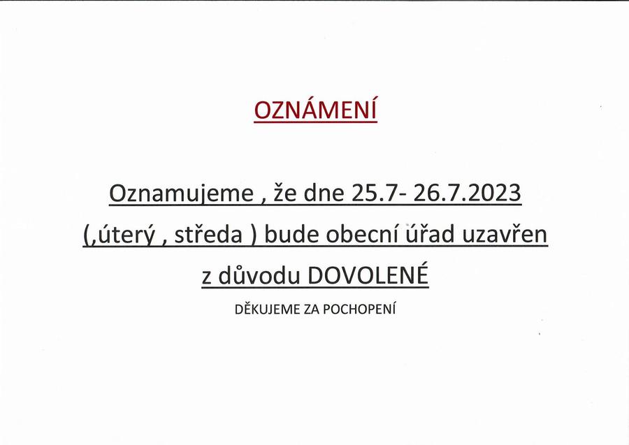 Oznámení o uzavření OÚ Plešnice z důvodu dovolené 25.-26.7.2023