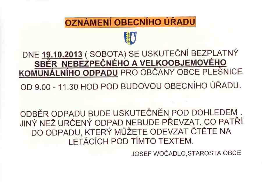 Oznámení ob.úřadu o bezplatném sběru velkoobj. a neb. odpadu pro občany obce