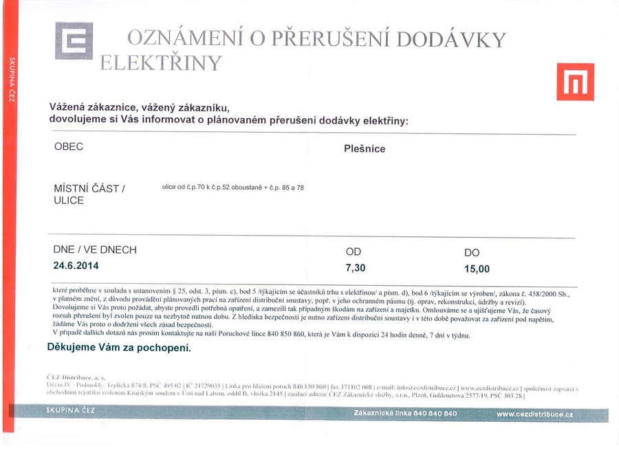Úvod > Aktuality > Oznámení přerušení dodávky elektřiny 24.6.2014
