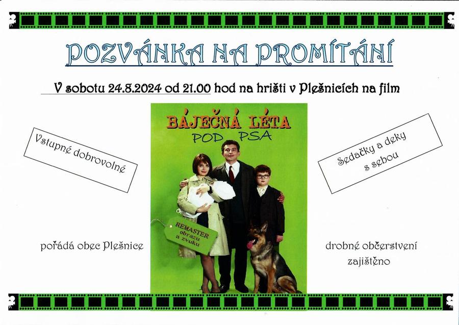 Pozvánka na promítání filmu BÁJEČNÁ LÉTA POD PSA 24.8.2024 od 21.00 hod
