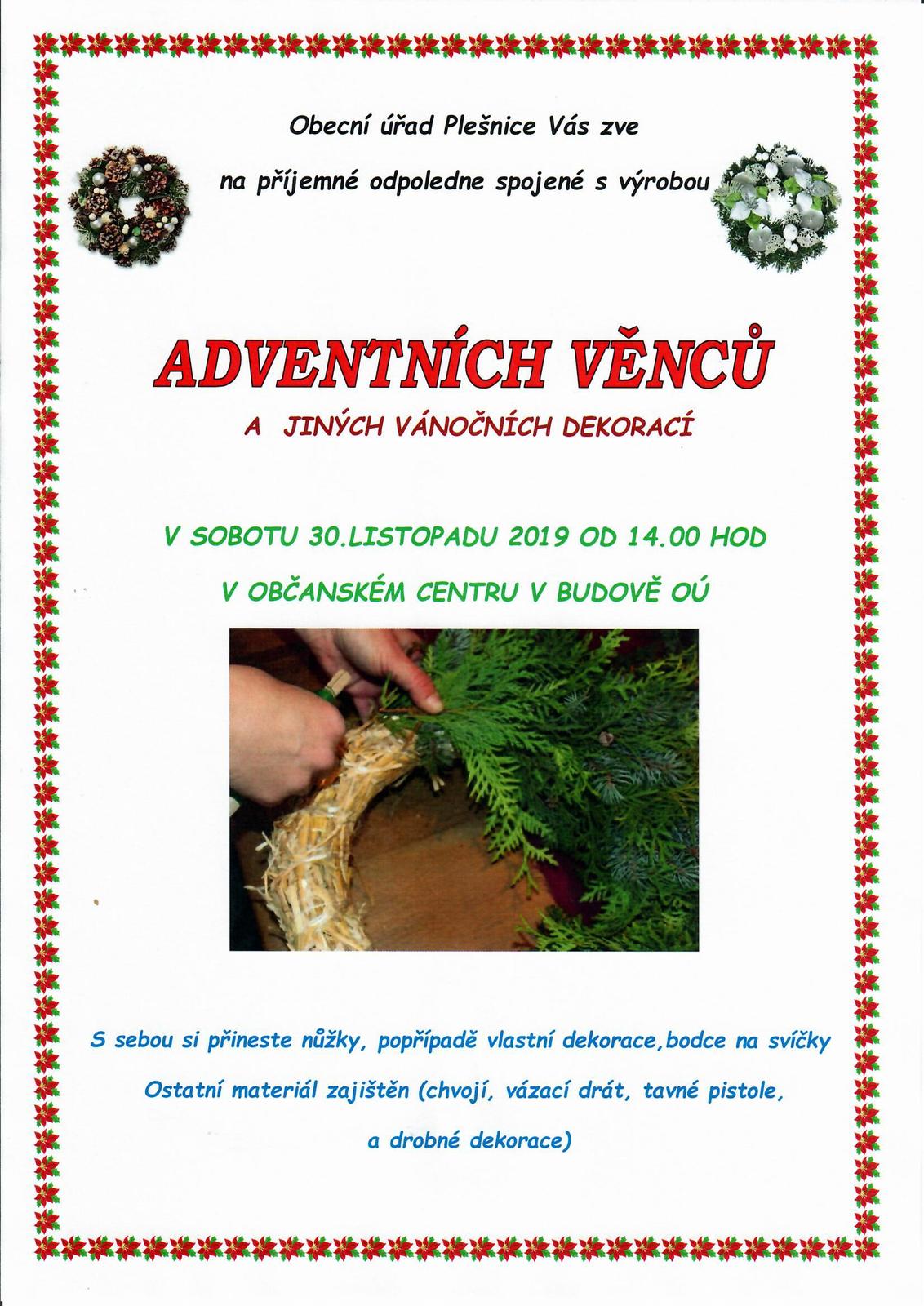 Obecní úřad Plešnice Vás zve na příjemné odpoledne spojené s výrobou VÁNOČNÍCH DEKORACÍ sebou si přineste nůžky, popřípadě vlastní dekorace, bodce na svíčky Ot Ostatní materiál zajištěn (chvojí, vázací drát, tavné pistole, ADVENTNÍCH VĚNCŮ  V SOBOTU 30. LISTOPADU 2019 OD 14.00 HOD  V OBČANSKÉM CENTRU V BUDOVĚ 011   a drobné dekorace)