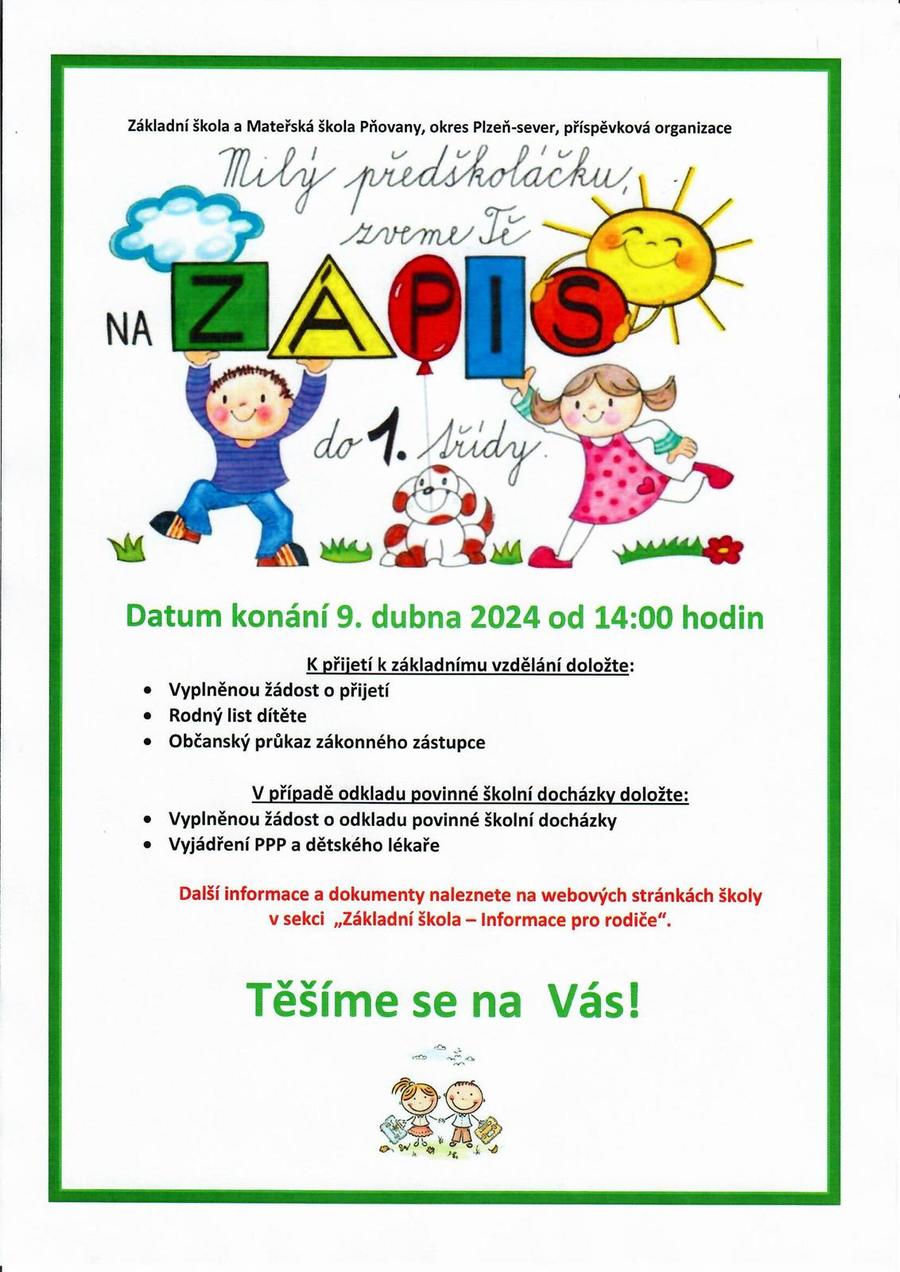 Úvod > Aktuality > Pozvánka na zápis do 1. třídy - ZŠ a MŠ Pňovany