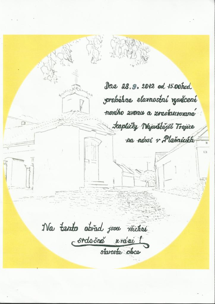 Dne 28.9.2012 od 15.00 hod proběhne slavnostní vysvěcení  nového zvonu a zrestaurované kapličky na návsi.