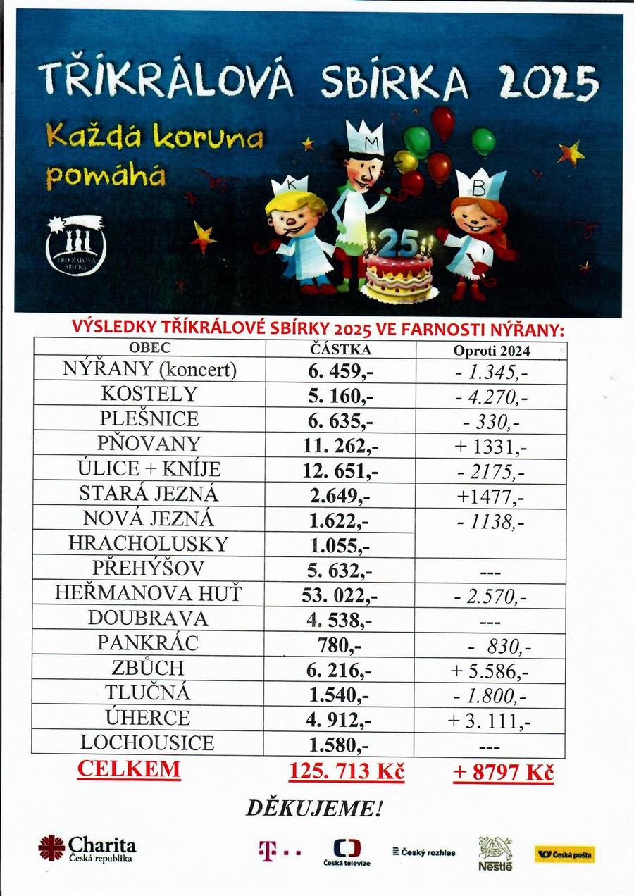 Úvod > Aktuality > Výsledky Tříkrálové sbírky v roce 2025 ve farnosti Nýřany